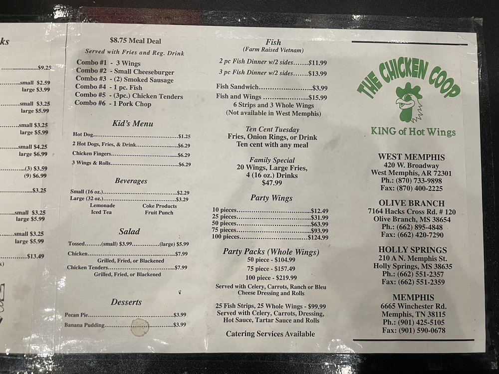 Welcome to The Chicken Coop, where Southern soul food meets delightful comfort! Nestled at 7164 Hacks Cross Rd, Olive Branch, this chicken shop is an unclaimed gem serving up rich flavors and hearty portions. The menu shines with options like crispy wings, tender chicken tenders, and flavorful fish dinners, with combo meals priced at just $11.49 each. Whether you're in the mood for a quick bite or planning a gathering, their party wings and vegetarian selections cater to all tastes.
